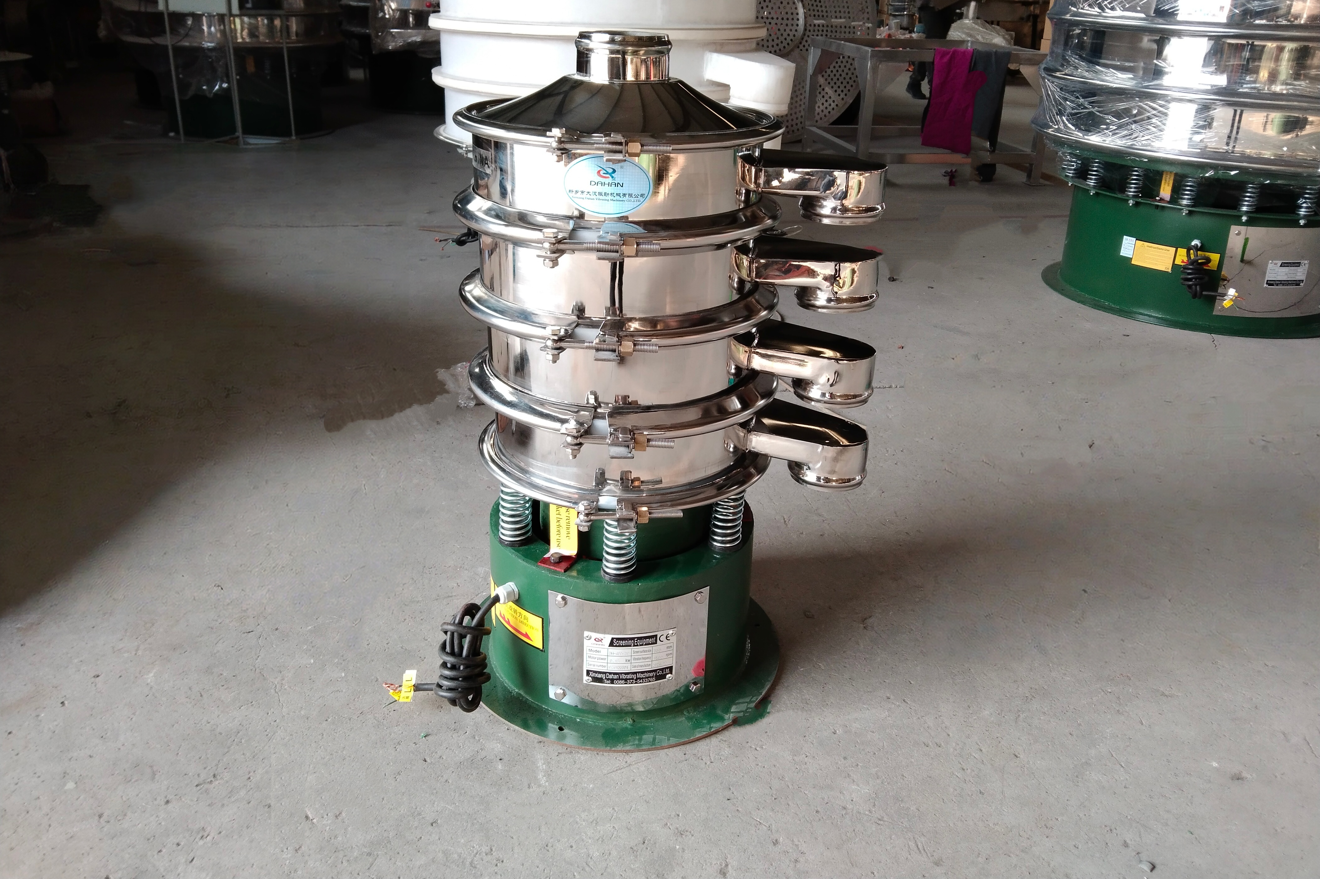 DH-400-3S 篩分機結構緊湊,一次可完成四級物料篩分,設備運行平穩、噪音低,全封閉設計有效抑制粉塵外溢,拆裝清洗便捷。采用優質振動電機,激振力穩定,篩網使用壽命長,可靈活更換目數。
