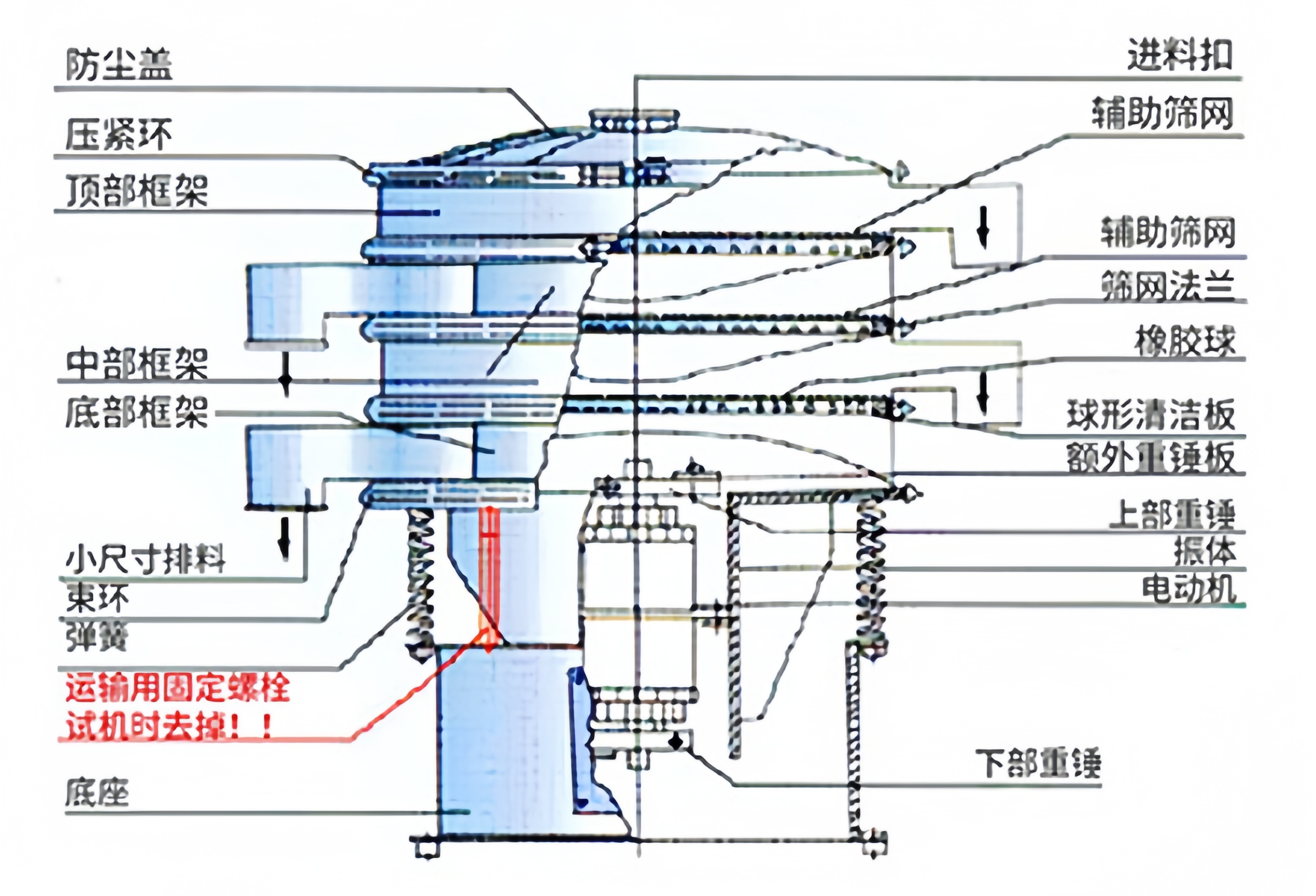 防堵設(shè)計(jì):每層配彈跳球清網(wǎng)裝置,強(qiáng)力防堵網(wǎng),適合細(xì)粉、易團(tuán)聚物料。